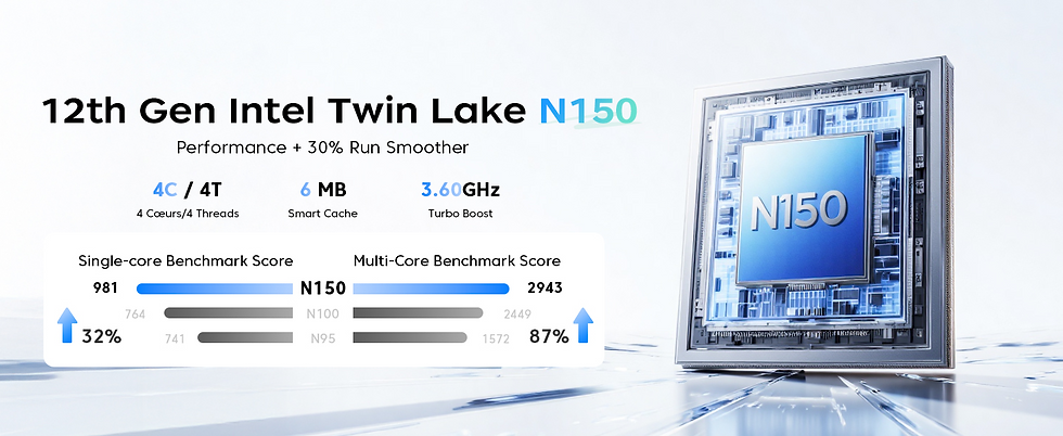 【Processeur Twin Lake-N150 : Vitesse et efficacité】Le TIVIQUE AX18 gère les tâches quotidiennes avec grâce grâce au processeur Intel N150 (jusqu'à 3,6 GHz), offrant des performances jusqu'à 20 % plus rapides que les processeurs N95/N97. Que vous travailliez au bureau, profitiez de jeux légers ou alterniez entre les applications, bénéficiez d'une performance fluide et réactive.